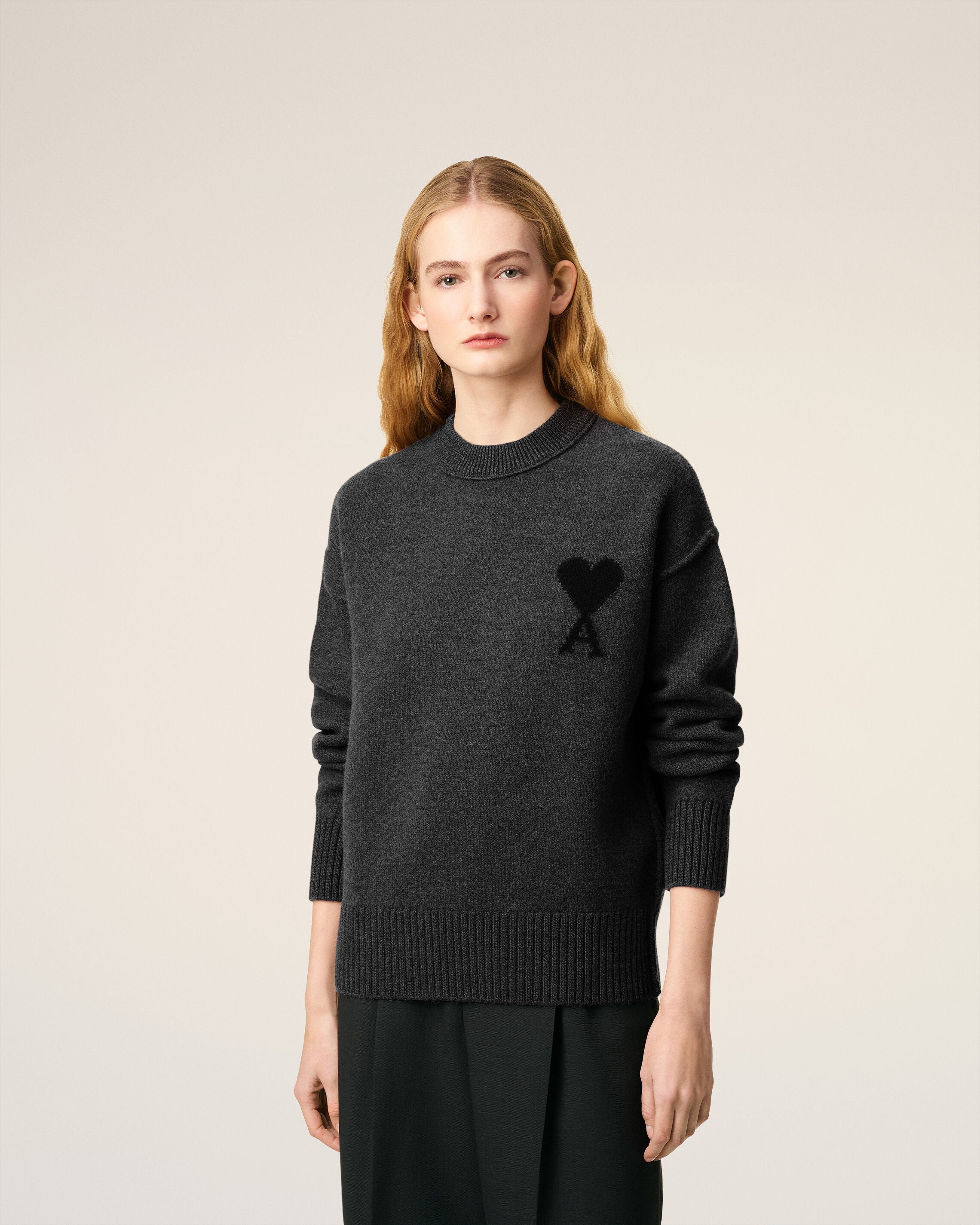 HEATHER GREY / BLACK Grey Wool Ami De Coeur Crewneck Sweater | AMI PARIS