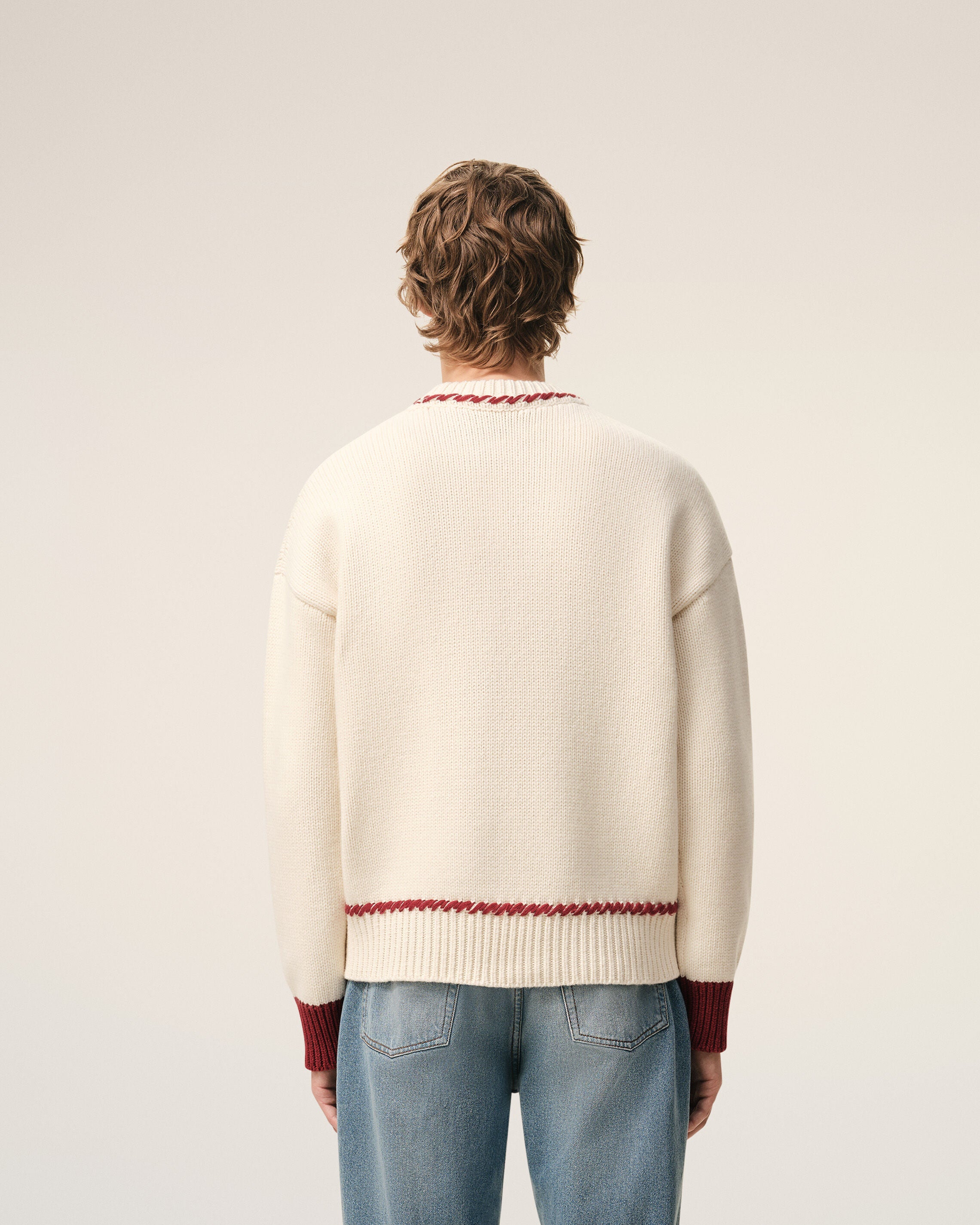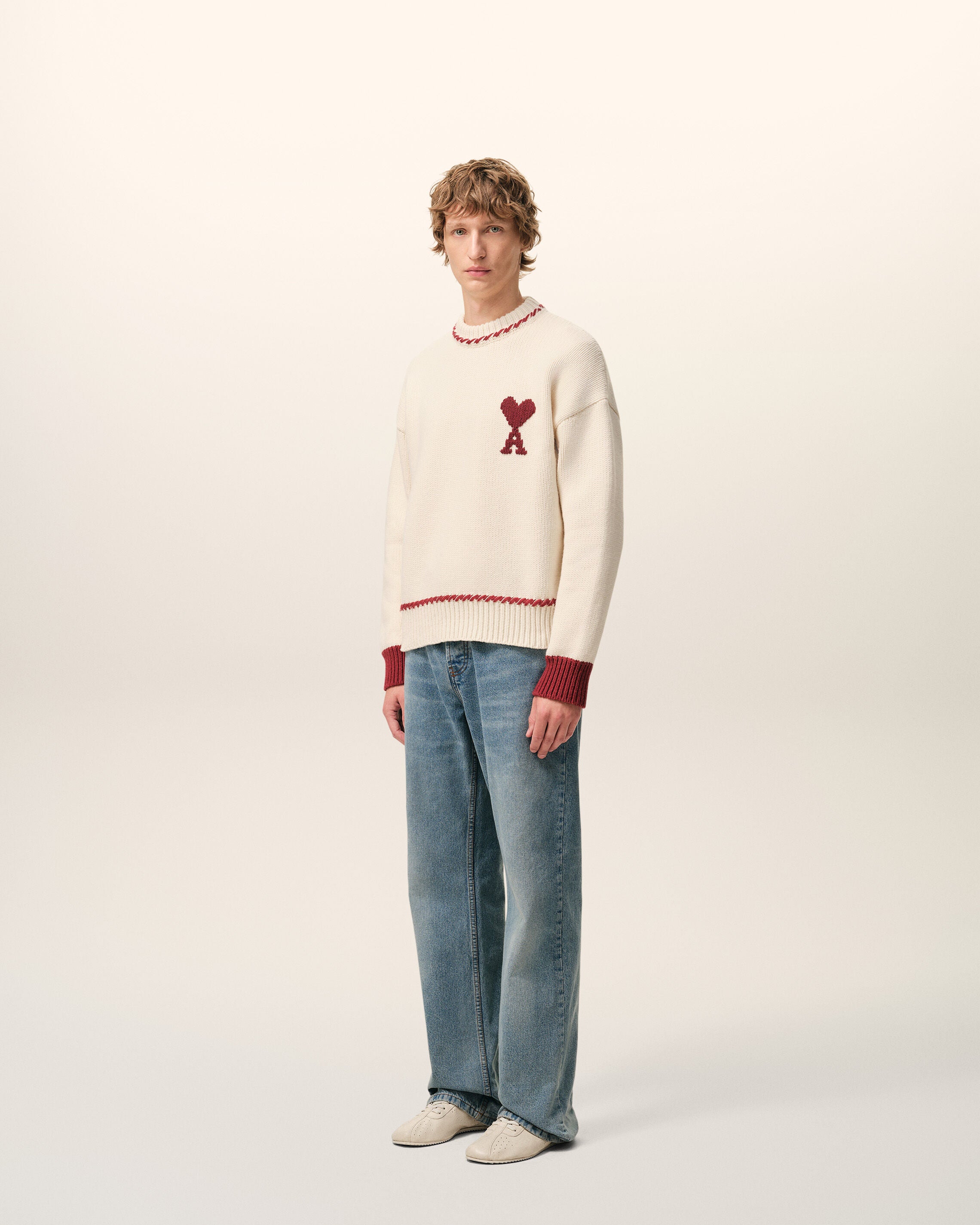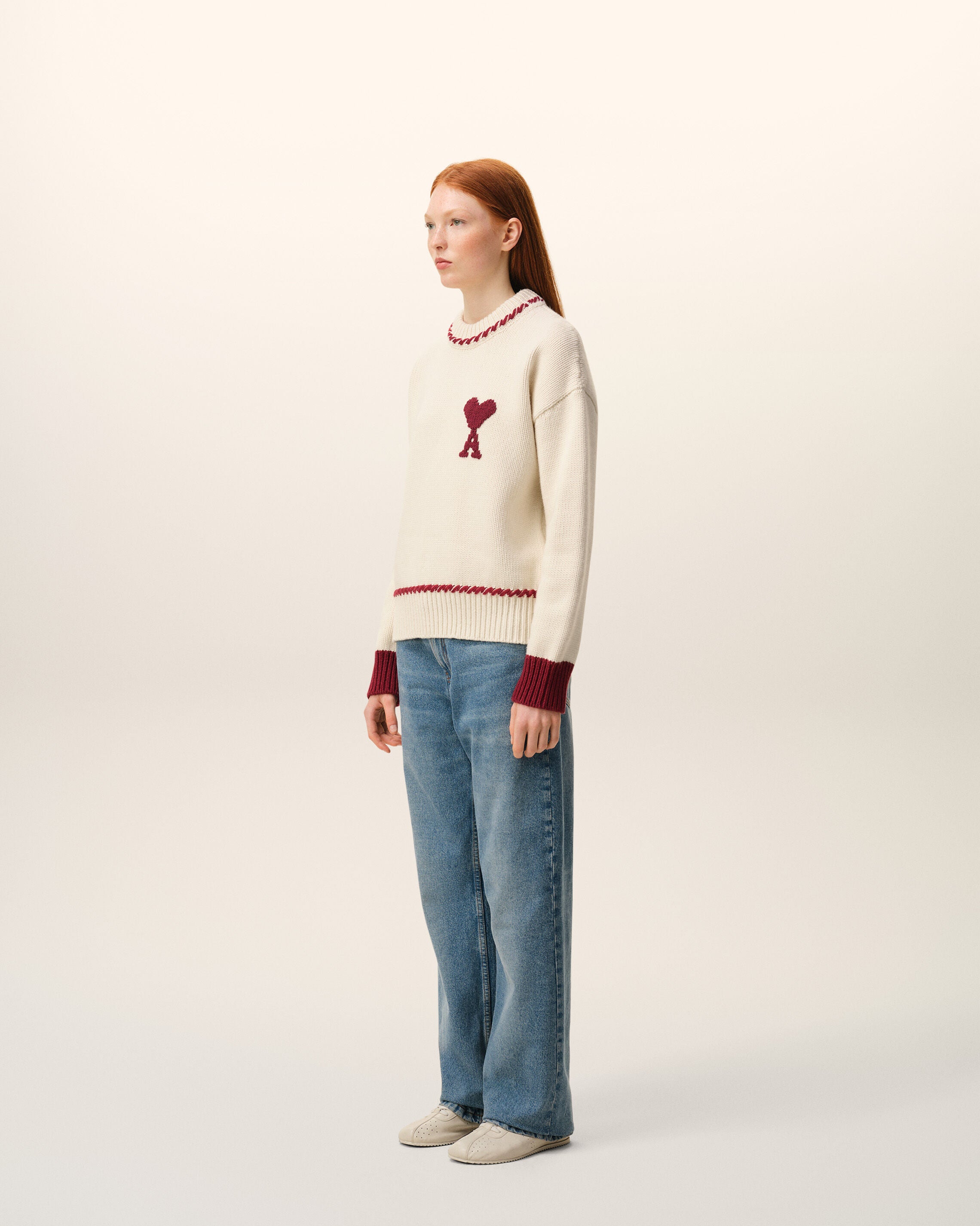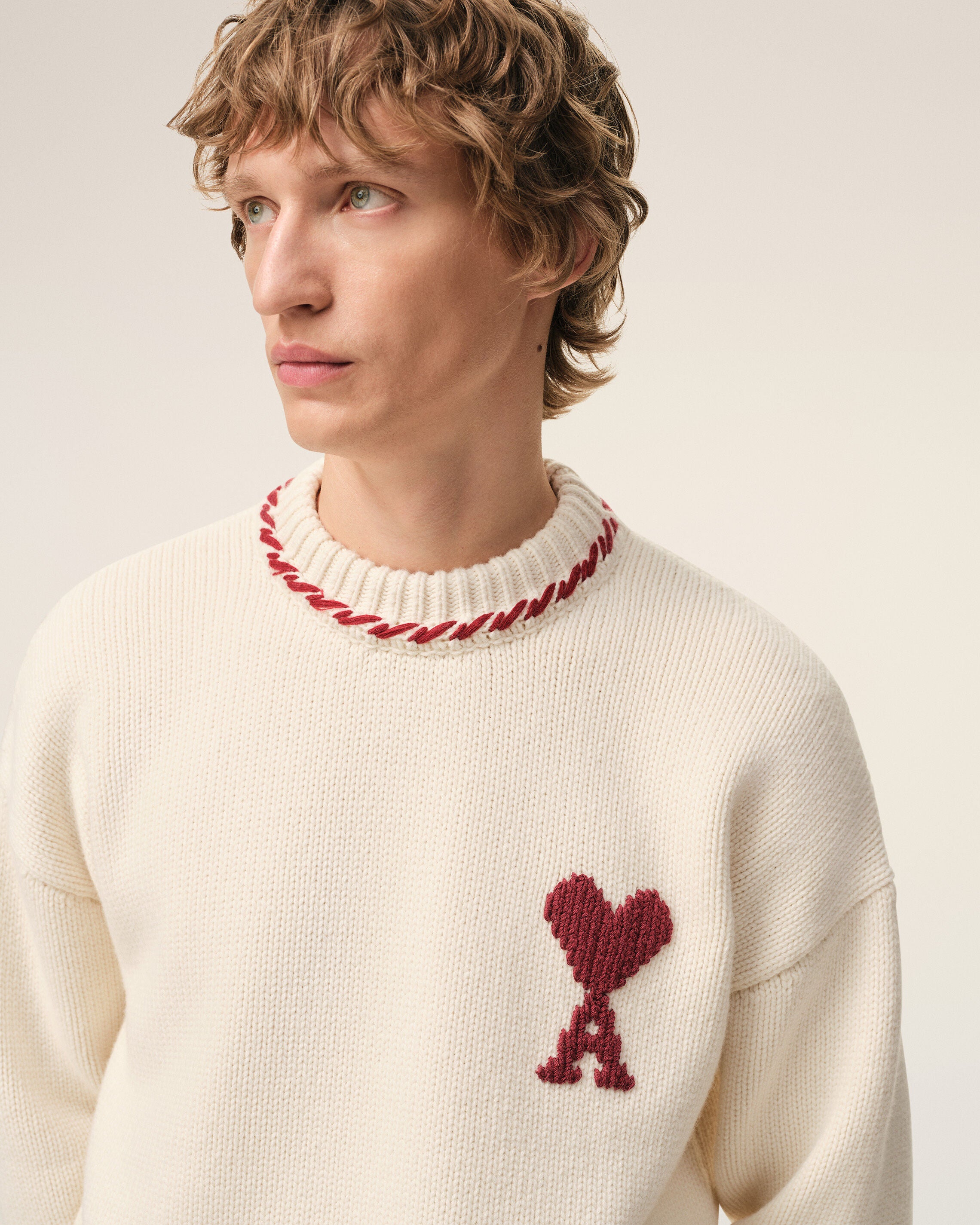 OFF WHITE/ RED White Wool Ami De Coeur Crewneck Sweater | AMI PARIS