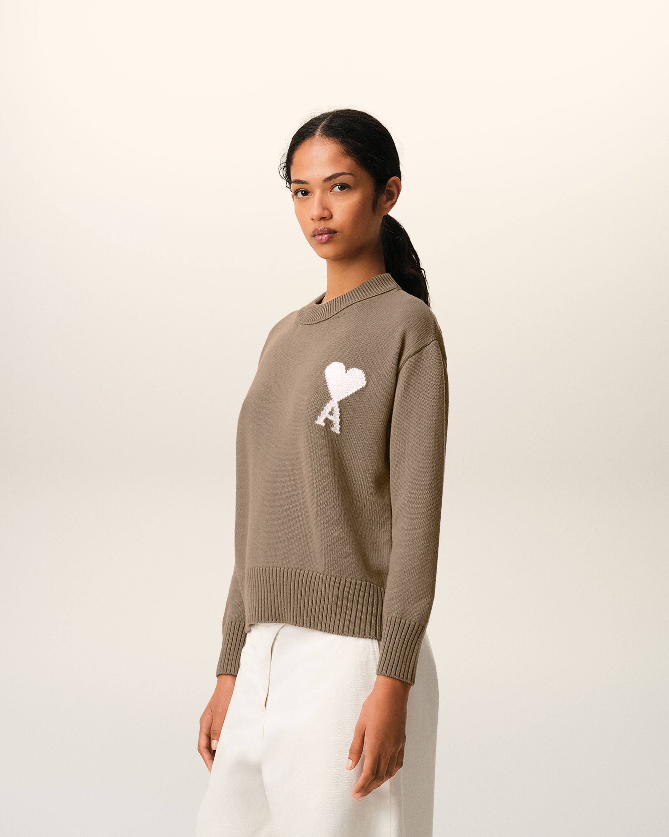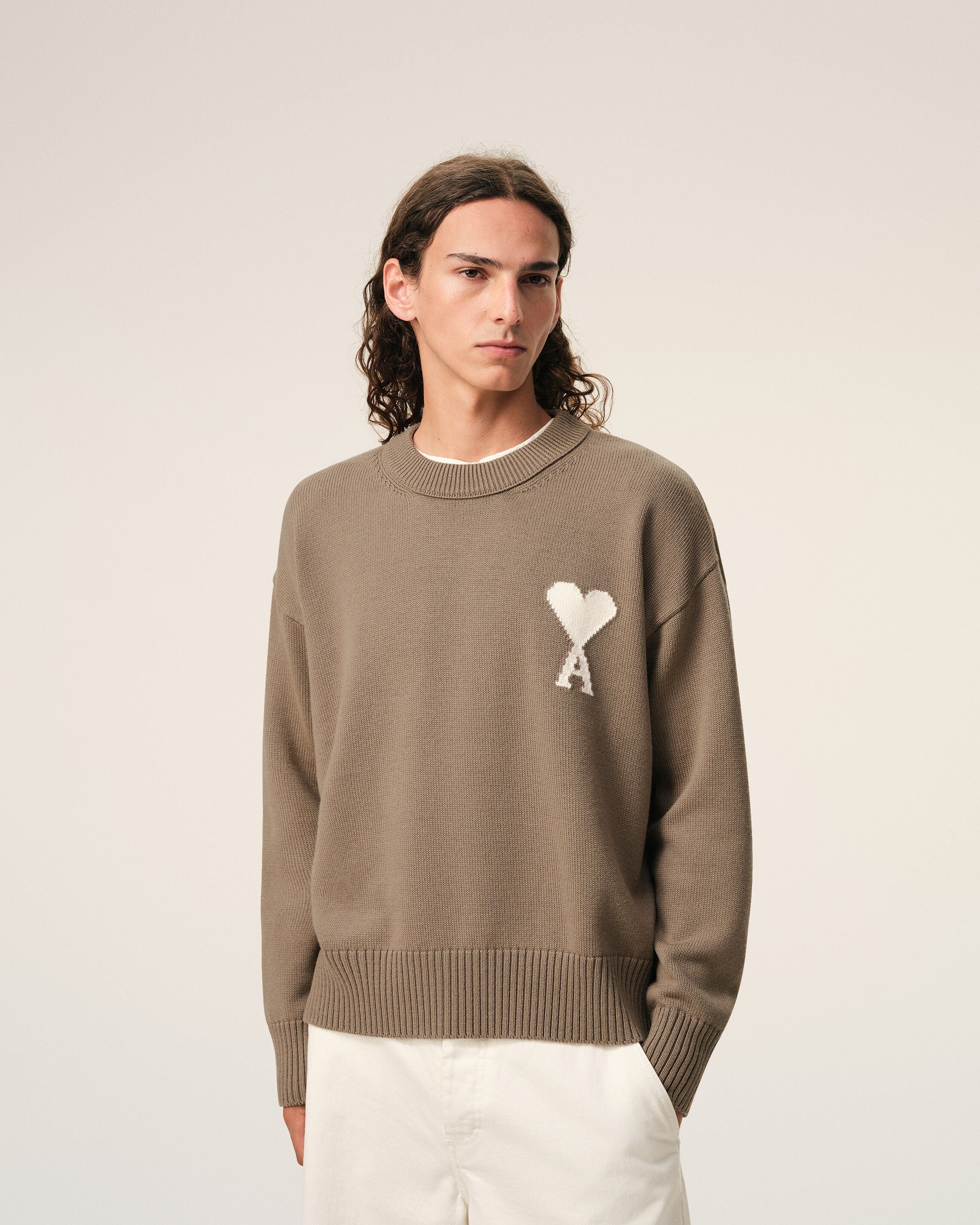 TAUPE BEIGE/OFF WHITE Beige Wool And Cotton Crewneck Ami De Coeur Sweater | Ami Paris